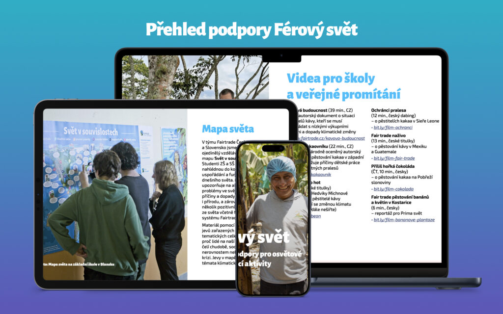 Také pro letošní rok přinášíme aktuální přehled podpory Férový svět. Najdete v něm různé příležitosti na materiály a akce, pomocí kterých se můžete ve svém místě věnovat osvětě a vzdělávání o Fairtrade a dalších globálních tématech. Z novinek bychom rádi vyzdvihli novou vzdělávací hru Kostarika, filmový dokument Kávová budoucnost a mapu Svět v souvislostech.