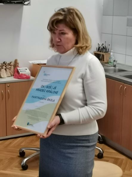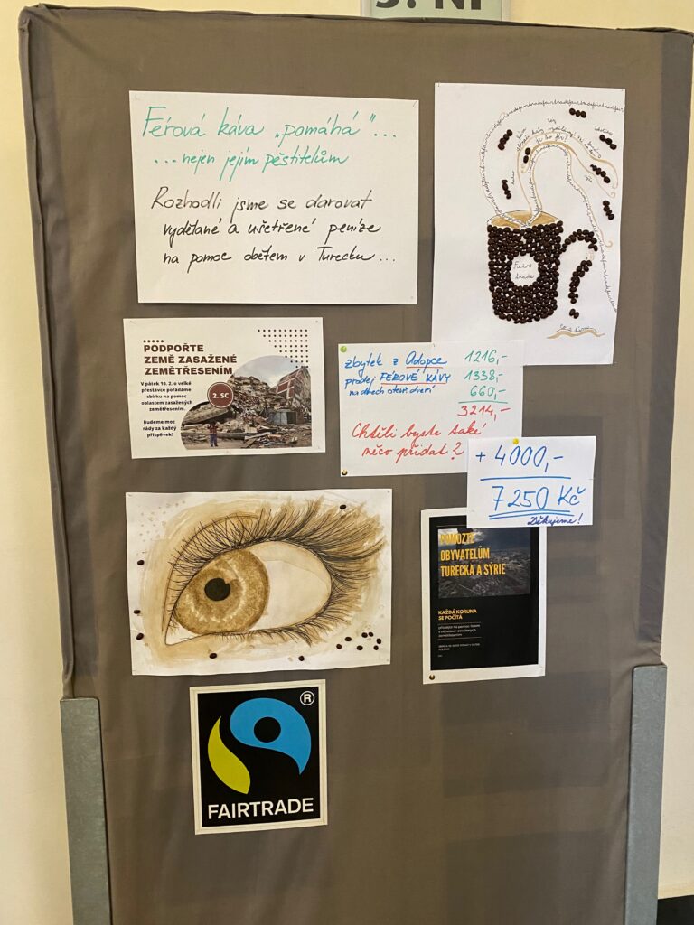 Již je to rok (únor 2022), kdy byla snaha řídicího týmu dovršena předáním titulu Fairtradová škola. Akce měla slavnostní i rukodělný ráz, nové posily týmu z prvního a druhého ročníku donesly domácí příspěvky ke společné fairtradové tabuli a v kulisách výtvarné pracovny s vystavenými grafikami, malbami a asamblážemi z kávy a kávových zrn si vyslechly i prezentaci Honzy Jíchy o Fairtradu na příkladu Kostariky. Od té doby jsme rádi navštívili přednášku o pěstování kávy v Kolumbii, za organizaci jsme vděčni Zdravotnické škole. Jsme rádi, že naše meziškolní spolupráce funguje a navzájem se podporujeme v různých nápadech – jednoznačně platí, že čím víc nás je, tím víc energie si navzájem dáváme.