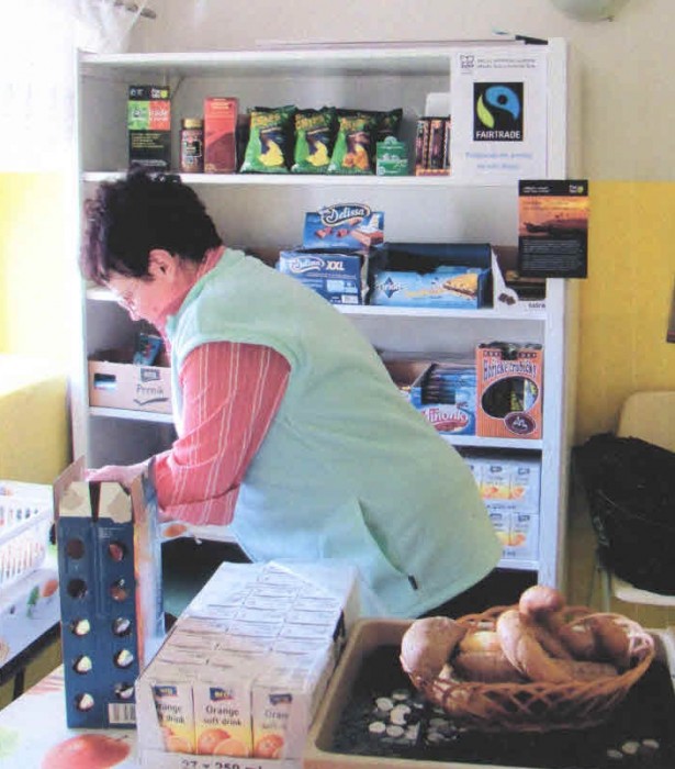 Fairtradové produkty jsou ke koupi ve školním bufetu. Žáci 5. třídy vyřizují objednávky pro rodičovskou veřejnost – shromáždí objednávkové lístky a při práci na počítači posílají hromadnou objednávku.
